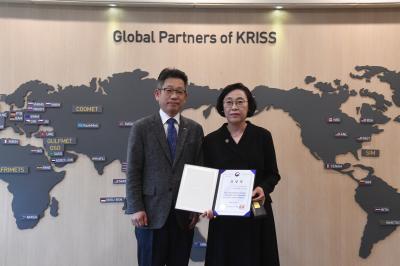 [ KRISS소식 ] KRISS, 제55회 과학의 날 기념 포상, 국가연구개발 성과평가 유공자 및 KRISS인상 수여식지난 5 월 8 일 ( 월 ) 원장실에서는 과학의 날 (4.21.) 기념포상자와 국가연구개발 성과평가 유공자 그리고 연구원 발전에 공헌한 우수 직원에게 수여하는 ‘3 월 이달의 KRISS 인상 ’ 수상자에 대한 시상이 진행됐다 . KRISS 는 제 55 회 과학의 날 (4.21.) 기념..작성일자 2023-05-16 조회수 1021