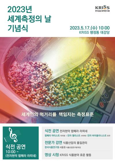 [ KRISS소식 ] 2023년 세계측정의 날 기념 행사 개최▲ 2023 년 세계측정의 날 행사 포스터 1875 년 5 월 20 일은 세계 17 개국이 ‘ 미터협약 ’ 을 체결한 날로 , 5 월 20 일을 세계측정의 날로 지정하고 각 나라에서 그 중요성과 의미를 되새기고 있다 . 지난 5 월 17 일 ( 수 ), KRISS 대강당에..작성일자 2023-05-19 조회수 1316