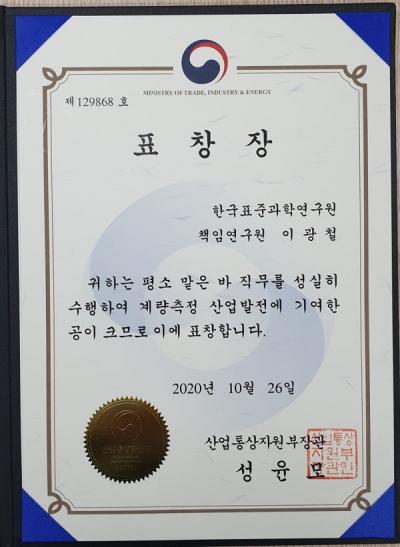 [ KRISS소식 ] 2020년 계량측정의 날 포상 - 이생희, 이광철 수상 -2020년 계량측정의 날 포상 - 이생희 책임연구기술원, 이광철 책임연구원 수상 - 지난 10월 26일(월), ‘2020년 계량측정의 날’ 행사가 서울 양재 엘타워에서 개최되었다. 이번 행사에서는 KRISS 유량측정팀 이생희 책임연구기술원과 플랑크상수질량팀 이광철 책임연구원이 각각 국무총리..작성일자 2020-12-11 조회수 2629
