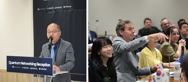 ‘퀀텀 네트워킹 리셉션’은 국가 간 양자과학기술 협력 강화와 글로벌 네트워크 확대를 목적으로 aT센터 지하 연회장에서 열렸다. 이번 행사에는 류광준 과학기술혁신본부장(前)을 비롯해 미국 QED-C, OECD, EU 등 주요 해외 대표단과 주한 대사관 관계자, KRISS 이호성 원장, 한국연구재단 백승욱 단장 등 국내 관계자 총 100여 명이 참석하였다.
