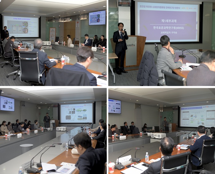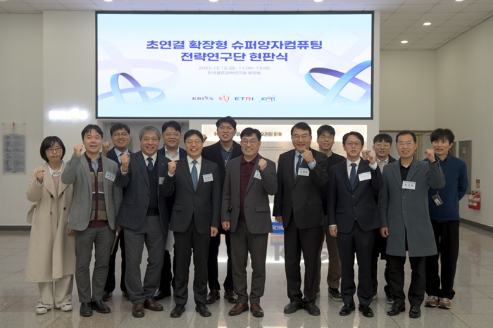 12월 12일, KRISS 행정동에서 ‘초연결 확장형 슈퍼양자컴퓨팅 전략연구단 현판식’이 진행되었다. 이 연구단은 지난 5월 글로벌 TOP 전략연구단으로 선정되었으며, KRISS가 연구단을 총괄하고 KIST, ETRI, KISTI가 참여하여 양자컴퓨터 간 연결을 통해 확장형 양자컴퓨팅 및 슈퍼양자컴퓨팅 기술을 구현하는 것을 목표로 하고 있다.