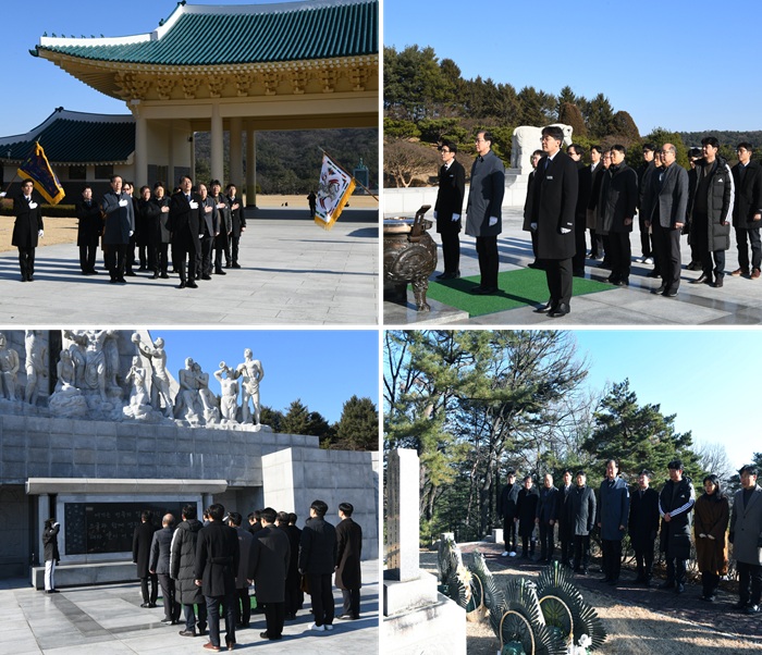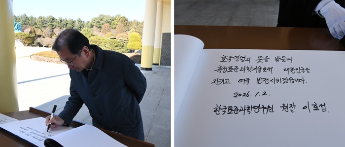 시무식을 마친 경영진은 오후 일정으로 대전 국립현충원을 방문하여 호국영령과 순국선열의 숭고한 정신을 기렸다. 이호성 원장은 참배에 앞서 방명록을 작성하며 선구자들의 뜻을 이어받아 2026년 한 해 동안 국가 표준의 위상을 더욱 높이고, 과학기술 강국으로서의 사명을 완수하겠다는 굳건한 다짐을 새겼다. 이어 최형섭 전 과학기술처 장관, 이종욱 전 세계보건기구(WHO) 사무총장, 최순달 전 체신부 장관, 그리고 KRISS의 기틀을 세운 김재관 초대 소장의 묘역을 차례로 찾아 헌화와 분향을 하며 참배를 마쳤다.