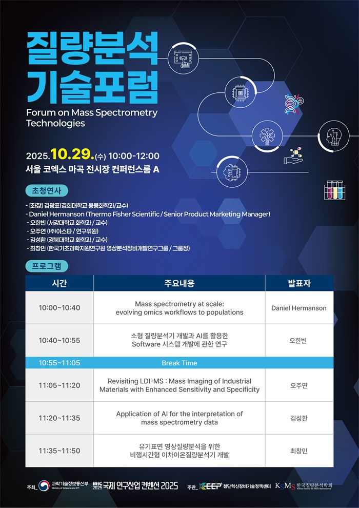 과학기술정보통신부와 국제 연구산업 컨벤션(IRIC) 2025가 주최하고 KRISS 첨단혁신장비기술정책센터(KEEP2, 센터장 강상우)와 한국질량분석학회가 주관하는 이번 행사에서는 국내외 최신 질량분석기술 동향 공유와 인공지능(AI)과의 융합을 통한 신기술 개발 등 미래 전망에 대한 심도있는 논의가 이루어졌다.