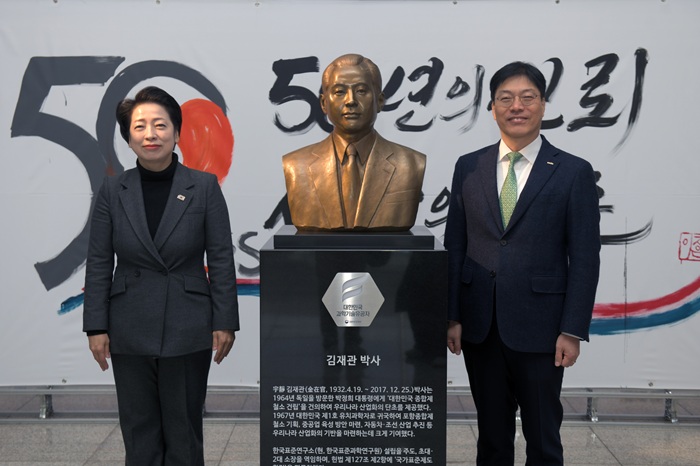 ▲ 김재관 초대소장 흉상과의 기념사진