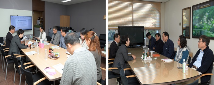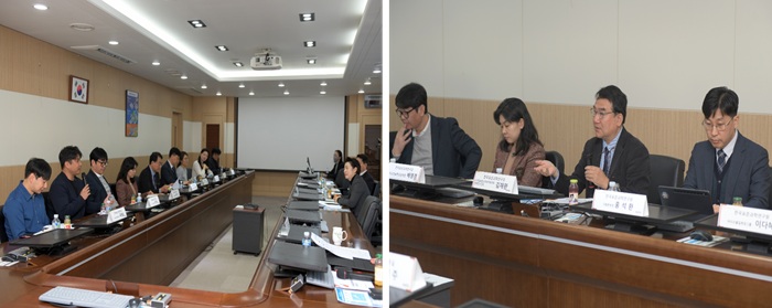 이후 행정동 4층 제1회의실에서 간담회가 개최되었다. 홍석환 기획본부장의 기관 업무보고를 시작으로, 참석자 전체 간 애로사항 공유 및 논의가 이루어졌다.