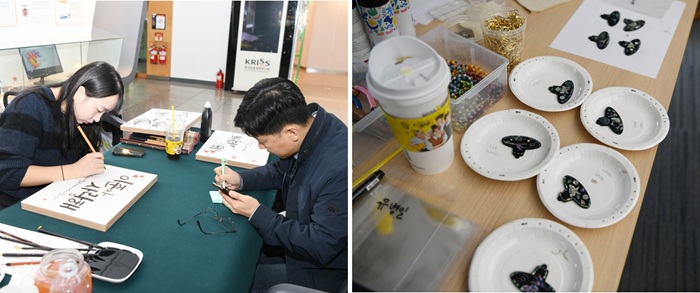 ▲ 가족 단위 체험 프로그램 : 가훈 붓글씨 적기(좌), 갓 키링 만들기(우)