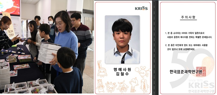행사 시작 전, 이른 시간부터 행정동 로비에 집결한 참여자들은 KRISS 명예사원증과 스탬프 투어 용지, KRISS 표준히어로 질문지, 개인별로 제공되는 푸짐한 다과를 수령하였다. ▲KRISS 명예사원증은 미리 신청한 KRISS 직원 가족들을 위해 특별히 제작한 기념용 사원증으로, 이날만큼은 가족 모두가 자랑스러운 KRISS 직원이라는 의미를 담아 제공되었다. 특히 KRISS 명예사원증은 자녀들에게 큰 인기를 끌어, 받자마자 목에 걸어보며 즐거워하는 모습이 곳곳에서 눈에 띄었다.