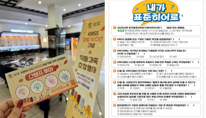 ▲스탬프 투어는 기관 소개 강연, 양자컴퓨터 연구실, 뉴턴의 사과나무와 같은 기관의 상징적 장소를 방문해 스탬프를 모두 모으면 기념품이 제공되는 형식으로 진행되었다. ▲ ‘내가 표준히어로’ 질문지는 KRISS에 관한 다양한 정보를 담고 있어, 모든 일정을 마치고 참가자들이 KRISS에 대해 얼마나 더 잘 이해하게 되었는지를 확인할 수 있도록 하여, 가족들의 참여도와 기관에 대한 이해도를 더욱 높이고자 하였다.