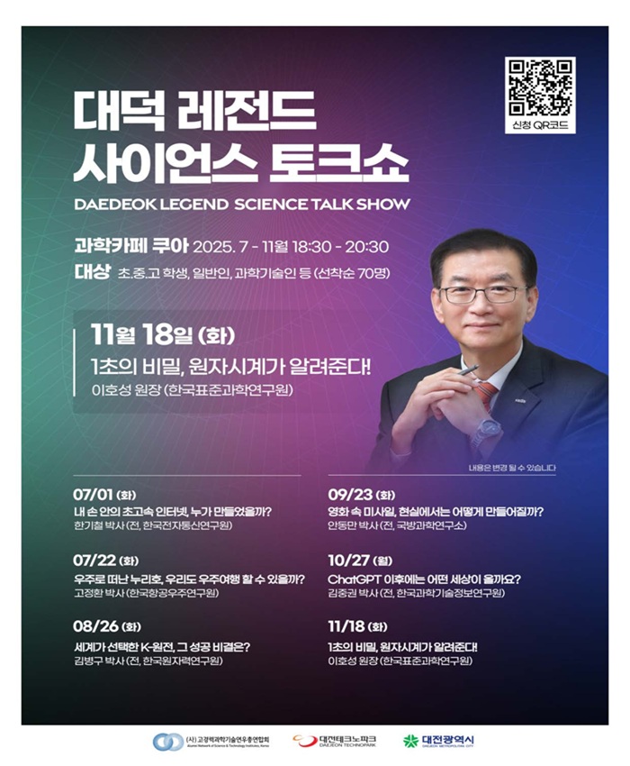 본 토크쇼는 대덕연구개발특구의 눈부신 성과를 일궈낸 주역들이 시민과 직접 소통하기 위해 기획되었다. 단순한 지식 전달이나 강연을 넘어, 국가 과학기술 발전에 기여한 ‘레전드 과학자’들이 직접 강연자로 나서 과학기술이 우리 삶과 사회에 미치는 가치와 영향력을 공유하는 양방향 소통의 장으로 마련되었다. 7월 1일 한기철 전 ETRI 박사의 강연을 시작으로 우주, 원자력, 국방, 인공지능 등 다양한 주제를 폭넓게 다뤘으며, KRISS 이호성 원장의 ‘1초의 비밀, 원자시계가 알려준다!’ 강연을 마지막으로 총 6회차의 시리즈를 성공적으로 마쳤다.