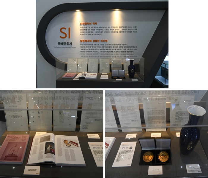 ▲ (위) 미터협약 기념 섹션, (아래) 미터협약 150주년 기념품들과 대한민국 미터협약 가입 문서
