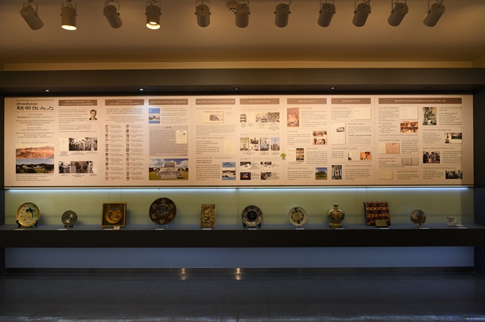 휴라운지 맞은편에 위치한 세종홀 왼쪽 벽면은 ‘미터협약 150주년 기념 섹션’으로 꾸며졌다. 이곳에서는 1959년 우리나라가 미터협약에 가입하기 위해 국무회의에 상정했던 안건 문서부터, 프랑스 정부에 제출한 미터협약국 가입 요청 서류, 그리고 프랑스로부터 최종적으로 수령한 가입 승인 문서까지 대한민국 표준 역사의 결정적 순간들이 담긴 사료들을 만나볼 수 있다. 단순한 기록물 전시를 넘어, 2025년 미터협약 150주년 기념행사를 위해 국제도량형국(BIPM)에서 제작한 기념 화보집과 메달, 기념 화병 등도 함께 전시되었다. 특히 눈여겨볼 전시물은 1875년 미터협약 당시 최초 서명국인 17개국을 상징해 국제도량형국(BIPM)에서 단 17점만 특별 제작한 기념 화병이다. 이는 최초 미터협약 체결 이후, 150년이 지난 오늘날 세계 최고 수준의 선진 측정표준기관으로 당당히 발돋움한 KRISS의 국제적 위상을 상징하는 특별한 전시물이 될 것이다.