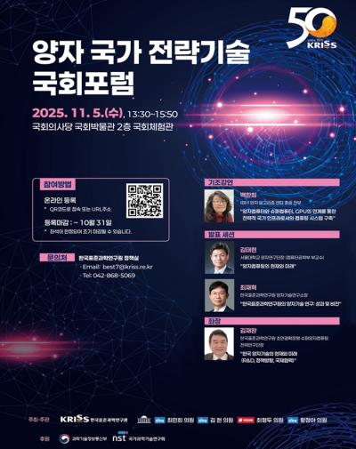 [ KRISS소식 ] KRISS, 창립 50주년 기념 ‘양자 국가 전략기술 국회포럼’ 성료[ 원내소식 ] KRISS, 창립 50 주년 기념 ‘ 양자 국가 전략기술 국회포럼 ’ 성료 대한민국 양자 기술주도권 확보를 위해 국회 정부 산학연 전문가 200 여 명 참석 - ▲ 양자 국가 전략기술 국회포럼 포스터 KRISS 는 지난 11 월 5 일 ( 수..작성일자 2025-11-17 조회수 90
