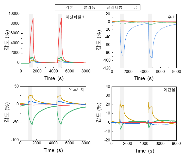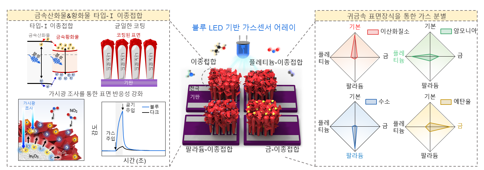연구진은 개발한 이종접합 구조 위에 백금(Pt), 팔라듐(Pd), 금(Au) 나노 입자를 입힌 센서를 배열해 '전자 코(E-nose)' 기능을 구현했다. 각 귀금속 촉매가 특정 가스에만 민감하게 반응하도록 설계해 마치 사람의 코처럼 여러 가스가 뒤섞인 환경에서도 유해가스인 수소와 암모니아, 에탄올을 명확히 구별해낼 수 있다.