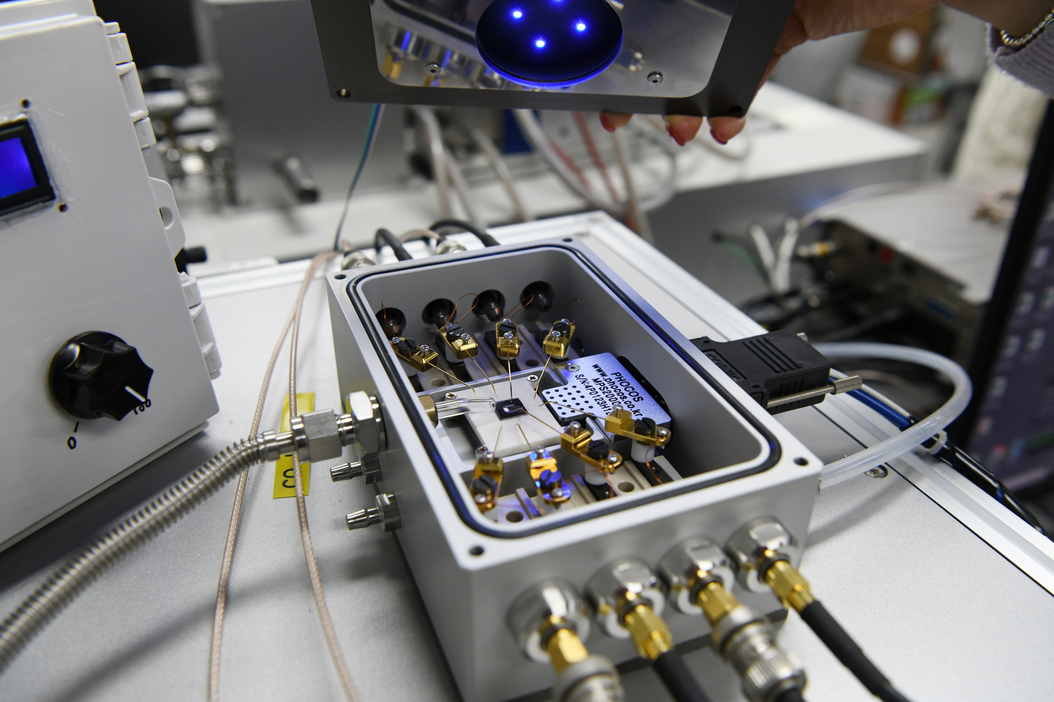 ▲ LED 기반 다종 식별 가스 센서 연구진(서울대학교 남기백 박사과정생)이 이산화질소 가스를 측정하고 있다.