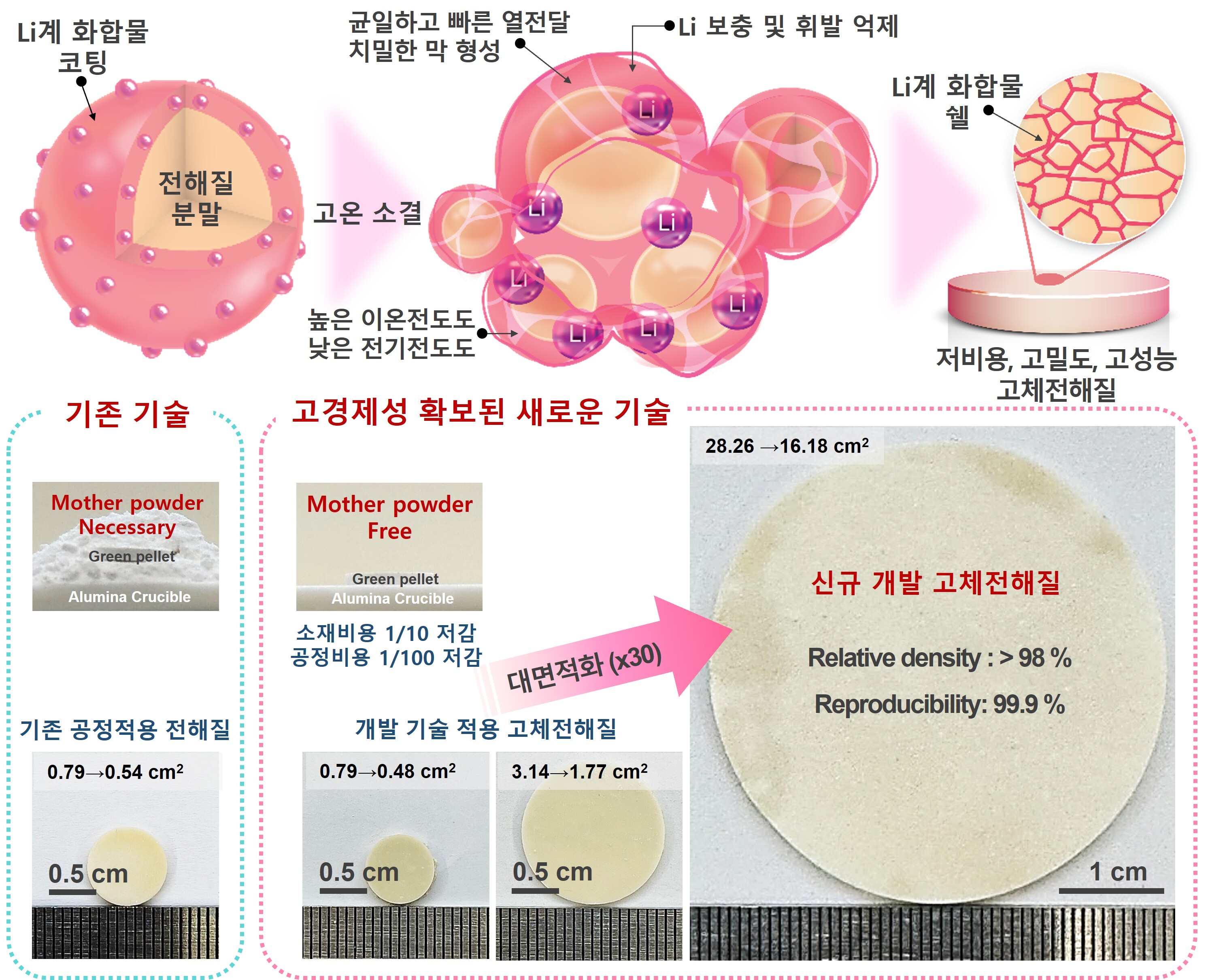 연구진은 기능성 리튬계 화합물을 고체전해질 분말 표면에 얇게 입히는 제조 기술을 개발해 이 문제를 완전히 해결했다. 표면에 형성된 코팅층은 소결 과정에서 리튬 원소를 공급하는 동시에 리튬이 휘발하지 않도록 보호하고, 입자 간 결합력을 높여주는 납땜(Soldering) 효과를 내어 전해질막의 밀도를 극대화한다.
